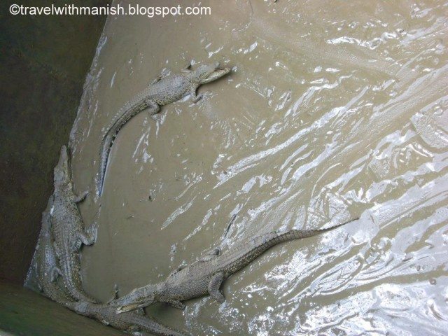 गौरी को उसी हालत में छोड़कर हम मगरमच्छ के शावकों को देखने आगे बढ़ गए। कीचड़ में लोटते ये शावक किसी भी तरह से भोले नहीं लग रहे थे इसलिए जब हमारे गाइड ने इन्हें हाथ से उठा कर देखने की पेशकश की तो हम सब एकबारगी सकपका गए।