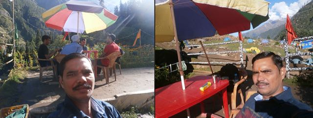 कैफ़े में आकर वापसी के लिए सामान इकठ्ठा किया और कैफ़े के प्रांगण में सुबह का चाय नाश्ता किया. इस स्थान पर अधिकतर कैफ़े, टेंट, कैंप आदि खाने पीने की व्यवस्था आस पास के गांव के स्थानीय ग्रामवासियों द्वारा की जाती है. सर्दी, बारिश और हिमपात जैसी विषम परिस्थितियों में ये लोग अपने कठिन परिश्रम से इस स्थान को आगंतुकों की सुविधानुसार तैयार करते है. इन स्थानीय ग्रामवासियों की अतिथि सत्कार की भावना और कठिन परिश्रमी स्वभाव की जितनी प्रशंसा की जाये कम है. चाय नाश्ते के बाद वापिस नीचे जाने से पहले कुछ देर आराम करने के बाद आस-पास के प्राकृतिक दृश्यों का आनंद लिया और धीरे-धीरे पग बढ़ाते हुए खीर गंगा से वापिसी का आरम्भ किया.