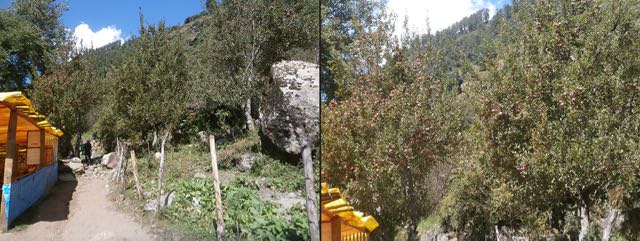 रुद्रनाग से आगे बढ़ने पर रास्ते में दोनों ओर सेब के बाग़ दिखने शुरू हो जाते है. यहाँ से कुछ ही दूर पर नकथान गांव है,