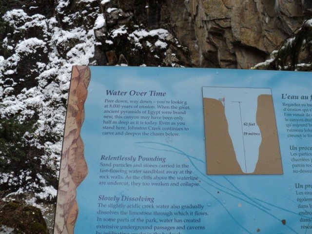 दूसरे दिन सुबह उठ कर आसपास और घूमने का प्रोग्राम बना. एक झरना है उसी को देखने चले. वहाँ बोर्ड लगा है ८००० साल में पानी का वहाव ६२ फीट नीचे चला गया. थोड़ा आगे जाने पर रास्ता बर्फ से ढका हुआ है बहुत फिसलन है. मनाली में बर्फ देखने रोहतांग या उससे भी आगे घोड़े पर जाते हैं, पर कैनेडा में बर्फ का नाम सुनते ही इरादा बदल जाता है, अब रोपेवे देखने चलना है.