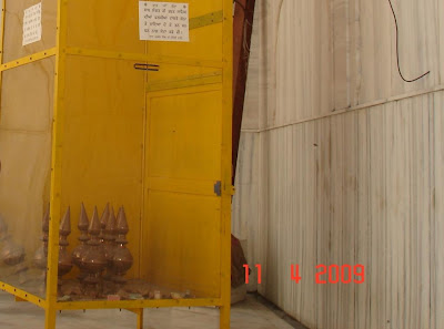 गुरुद्वारे में घुसने के पहले ही इस पीले रंग के इनक्लोसर में कुछ पात्र रखे थे और गुरुमुखी में कुछ लिखा था। इसका क्या मतलब था ये तो कोई इस लिपि को जानने वाला ही बता सकेगा।