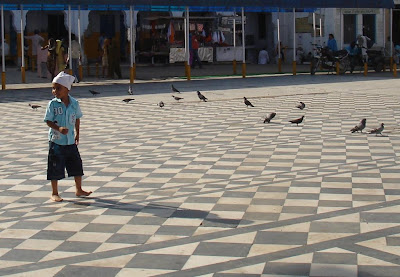 और ये हैं हमारे सुपुत्र जो सामने के खुले प्रागण में कबूतरों के साथ चित्र खिंचाने के लिए जलते तलवों की परवाह किए बिना दौड़े चले आए।