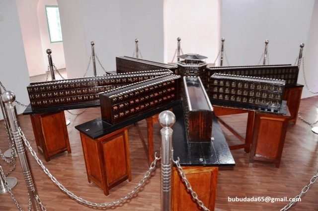 [Then we went upstairs. A big wooden model of Cellular Jail was put on a table, which was placed in a circular room. For better stability, each end of arm of the model was given wooden support from the bottom. What a nice & elaborate model displayed over there. But we did not know name of the artist who made the model.