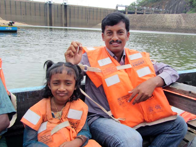 We collected our tickets for the boat ride(Rs 30 per head)and descended down to the water’s edge where the boats were waiting. I must add here that the weather had turned cloudy as we reached the dam and there was a slight drizzle. The weather and the greenery of the hills, more than made up for my disappointment at the water level in the dam and we enjoyed ourselves immensely in the boat ride to the falls. The motorboats take 10 to 15 minutes to reach the waterfalls and since these are small and low-level boats, we can stretch our hands and physically feel the cold waters. Everyone became children on the ride.