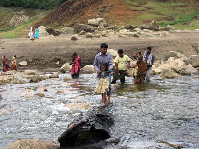 My brother-in-law too joined us on the trip and we left Tiruppur, my hometown, by Coimbatore-Nagercoil Express, on the night of August 31 to Tirunelveli. We arrived in Tirunelveli at 6 am. Since we were to travel back the same night, I decided not to book a hotel(Also last minute enquiries revealed that all rooms around Tirunelveli town centre were heavily booked because of the peak wedding season). We freshened up at the Station itself and had an early breakfast at Hotel Janakiram(very neat and tasty restaurant). Then we booked a Tata Indica near the Railway Station and started for our first stop: Manimuthar waterfalls, 50 km from Tirunelveli. We drove through sparse early morning traffic and reached Manimuthar Dam checkpoint at around 8.30 pm. There you pay Rs.15 per head and Rs.15 for the car as forest entrance charges(Another 40 rs was collected as car parking charges one km prior to the checkpoint). From the forest check post, we drove through poorly maintained roads for the next 5 km to reach the falls.
