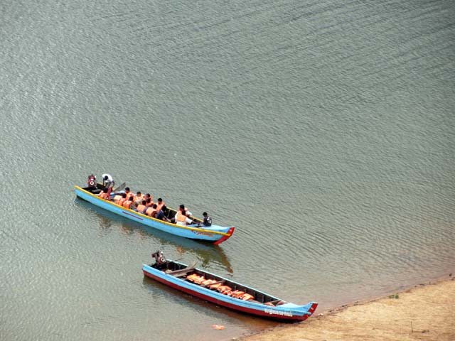 After some 10 minutes on the boat, came the moment we were waiting for. As the boat neared the falls, we could hear the roar of the waterfalls and everyone screamed, shrieked and gasped in delight at the sight of the milky white falls, thundering down from lofty heights. After looking at the water level in the dam, we did not anticipate such a volume of water at the falls and we were pleasantly surprised. The surrounding lush greenery provided such a contrast that the water looked really milky from a distance. Really the beauty of the falls in such lush forest surroundings is a sight to behold and no words can adequately describe it. We got down from the boat and just stood dumbstruck, letting the moment and the scenery sink in for a few minutes. We were very happy to have selected such a beautiful place to visit and also cursed ourselves for having missed it for so long.