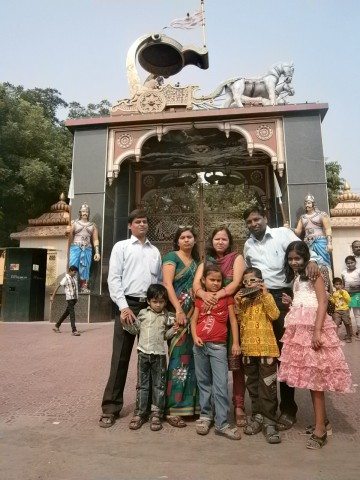 इस बीच रितेश जी से फ़ोन से लगातार संपर्क हो रहा था और हम जैसे ही साइकिल रिक्शा पर सवार हुए वैसे ही उनका फ़ोन आ गया और उन्होंने बताया की वे लोग जन्मभूमि मंदिर पहुँच चुके हैं तथा मंदिर के बाहर खड़े हमारा इंतज़ार कर रहे हैं। अब कुछ ही मिनटों में हम एक ऐसे व्यक्ति तथा उनके परिवार से मिलने जा रहे थे जिनसे हम घुमक्कड़, फेसबुक तथा फ़ोन के माध्यम से बहुत अच्छे तरीके से परिचित थे लेकिन कभी मिले नहीं थे, मन में एक अलग ही तरह का रोमांच तथा अनुभूति हो रही थी, अंततः वह क्षण आ गया।