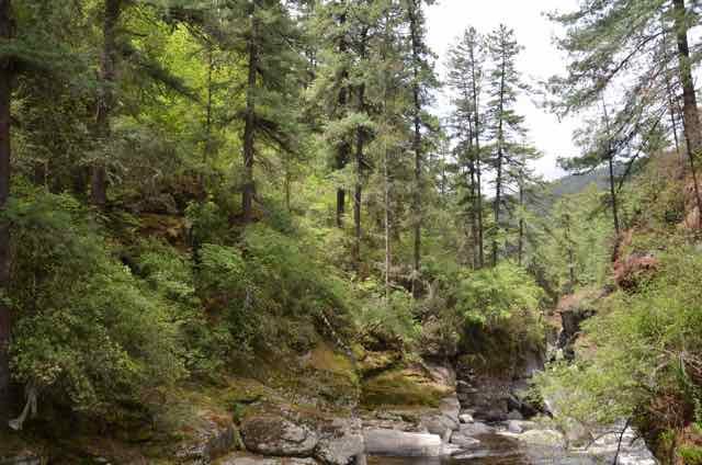 The spot was literally dangerous, because one minor slip would throw a person deep inside the fast flowing stream. The place was covered with tall trees, restricting sunrays to come down even in summer. The atmosphere was tranquil and cool, totally synchronised with our morning mood. The surroundings and ambience reminded me of river Dudhganga of Yushmarg, Kashmir. Chirping of the birds, burble of the rivulet, seamless sound of crickets with no one around (except speechless ourselves) made to feel the place like heaven.