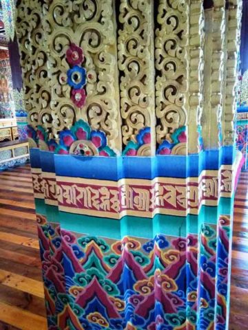 Painting on the pillars inside the Kenchogsum Lhakhang. Please note the alphabets, which appear to be a hybrid of Sanskrit and Tibetan alphabets