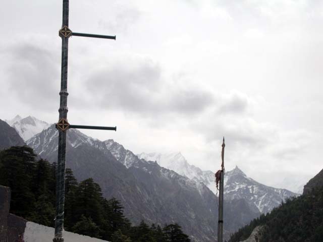 Water started to flow down the hill crossing road (damaging it) from multiple points. The turns were muddier and appeared slippery. All of a sudden a silenced atmosphere appeared in the car, everybody was quite including our music player. I could able to sense their tension but said nothing or not even reacted, just concentrated on road. By 6 pm, we started to look for a good place to spend night, as it was too much for the day. We stopped in small village, Dharali, some 18 km before Gangotri and so did the rain. There were around max 20-25 houses, all lodges, I guess and couple of restaurants. After taking 15-20 minutes rest, we came out for sightseeing, as the river Bhagirathi and mountains behind her were marvelous. After roaming for an hour we came back to the village and had our dinner. At the start of the trip only we have decided that we will have dinner no later than 8 pm and will sleep (try to) by 9 or 9:30 max. This will give us enough sleep before getting up again early next morning. I made it very clear that by any means we should be on road by 6 am, keeping IST in mind.