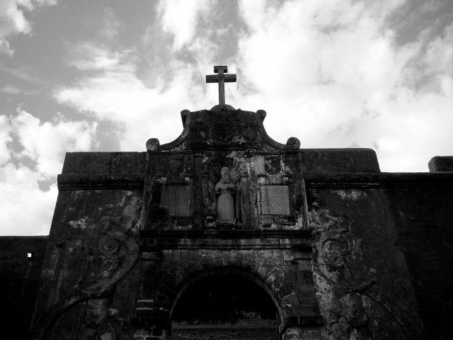 Just outside the fort, the view of the small fishing boats is quite interesting. The entrance of the fort had two giant figures drawn on both sides. It was truly an awe-inspiring sight. Right above the entrance gate is the statue of St. Jerome. There were inscriptions in Latin on the walls that looked like some biblical message. The first feeling that struck me as soon as I saw the fort was its deteriorating condition. It was irritating to see the quintessential names of locals who use these monument walls to proclaim their love for someone. The monument was not maintained at all. We quickly entered the fort and started to trace the path along the fort walls. From one juncture, the sight of the sea was simply amazing. With the rays falling from the sun, partially hidden behind clouds, on the sea beneath, it looked as if the colors were varying by distances. I instantly captured the sight with my camera. I also took a few photographs of the cross that was erected on the top of the fort wall along with the church and cemetery. We quickly surveyed the whole place and soon bade adieu to this ancient monument.