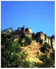 The roads are quite narrow and at some stretches only one vehicle can pass thus it is advisable to be quite vigilant and drive safely. The villagers alongside are quite eager to help all through. Just at the end of one of the forks one can see a narrow road leading to Bhim ki dungari and the other towards Jain nashea. taking the left road ends on the red sandstone gate leading to the majestic Jain temple. The view of the main temple is quite soothing standing tall against the backdrop of the setting sun straining through the dark clouds. Just to the left of the road leading to the Jain temple is the Mughal era structure which is believed to be emperor Akhbar’s place of rest during his long hunting expeditions…