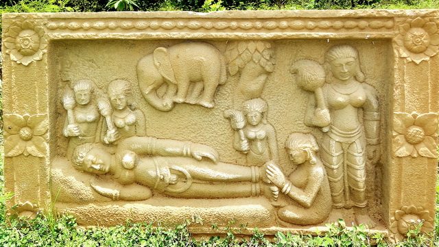 According to legend, Queen Maya dreamt of four angels carrying her to heaven, where she is bathed, anointed and dressed in fine clothes. A magnificent white elephant approaches her, holding a lotus with his trunk. The elephant walks around her three times before touching her on her right side and disappearing into her womb. The queen narrates the dream to her husband, King Shuddhodana who orders the royal priests to interpret it. They declare that the dream portends the birth of either a great conqueror or a great sage.