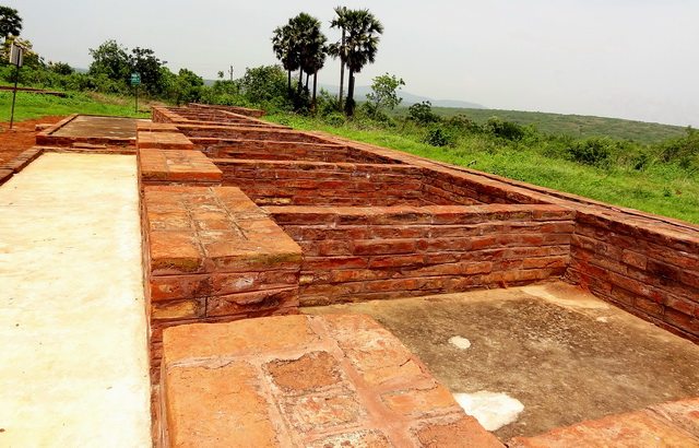 Beyond this park, the road gently ramps its way up, past the landscaped hillside all the way to the top, which is about 130 metres above sea level. Spread over a wide area, one has a commanding view of the beautifully curved of shoreline of the Bay of Bengal. A pleasant breezes wafts across from the sea, heightening the ambience. Â No wonder the ancient Buddhists chose this site for setting up an important base here.