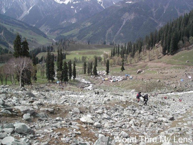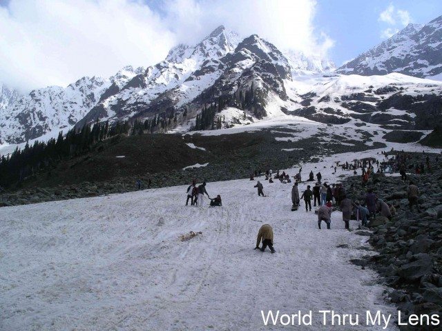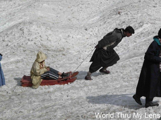 We had to trek uphill over rocks to reach the tip of the glacier. The reward – play on fresh snow and come sliding down over a sled … tempting …. My wife and older daughter took the longer route on horseback. I decided to climb along with my 8 year old daughter. Even the trek of 2-3 kms is tiring. Our breathing becomes laborious. Fortunately, I hired the locals who put my daughter on a sled and dragged the sled up the glacier. I met the locals at the agreed point. Meantime, some of my friends also joined us. I probably spent more time balancing myself on the steep glacier than enjoying the snow! Going downhill on the glacier was exhilarating!
