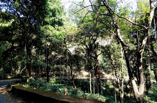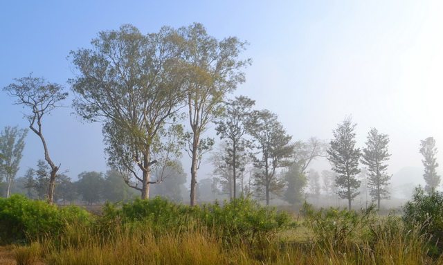 As the sun rises up in the skies, some of its rays pierce the leafy canopy and gradually, the fog thins out, revealing the landscape around us, a hilly terrain populated by a wide variety of trees and flowering shrubs.