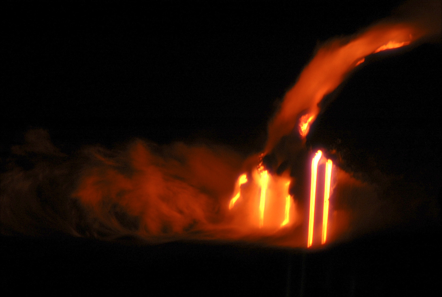 We spent over an hour there and turned back only when it started drizzling. Night had set it, but luckily for us it was a full moon day. Even otherwise we had come equipped with flashlights. The rest of the hike would have been lackluster except that in the mountains, another vent became active and lava started flowing out. What started as specks of light became a flow of at least mile lava flow by the time we got done. It was an amazing sight that would remain etched in our memories forever.