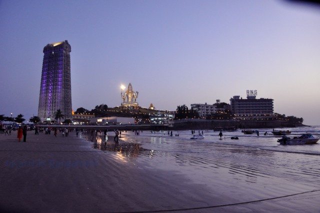 The crowd begins to thin down as the sun goes down and by 8pm the small town of Murudeshwar becomes quiet and the only profound sound that can be heard is that of the waves. The lights come on the Temple facade and on the kanduka hill.