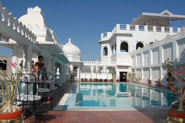 हम जब भी अपने होटल से बाहर निकलते थे तो लेक पिछोला होटल की बगल में हनुमान मंदिर और हनुमान घाट के नाम से एक घाट देखा करते थे। इसके ठीक सामने उदय कोठी नाम से एक भव्य बहुमंजिला होटल भी दिखाई देता था। सड़क पर जो बोर्ड लगा हुआ था, उस पर लिखा हुआ था कि इस हैरिटेज होटल की rooftop पर एक स्विमिंग पूल है। मैने अपनी श्रीमती जी से कहा कि आओ जरा देखें तो सही कि इस होटल में क्या – क्या है। वह संकोच करती रहीं कि अगर होटल वालों ने मना कर दिया तो? मैने कहा कि मना करेंगे तो वापस! पर रिसेप्शन पर जाकर हमने कहा कि हम आपके होटल का स्विमिंग पूल (तरणताल) देखना चाहते हैं तो उन्होंने हमारा स्वागत किया और कहा कि शौक से पूरा होटल देखिये। वास्तव में इस होटल की सबसे ऊपर की मंजिल (शायद पांचवी या छटी मंजिल होगी) पर तरणताल देख कर तबीयत मचल उठी कि इस गर्मी में थोड़ी सी तैराकी हो जाये पर फिर मन को काबू में करके सिर्फ कुछ फोटो खींच कर वापिस आ गये।