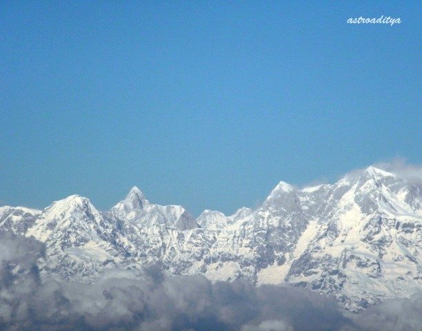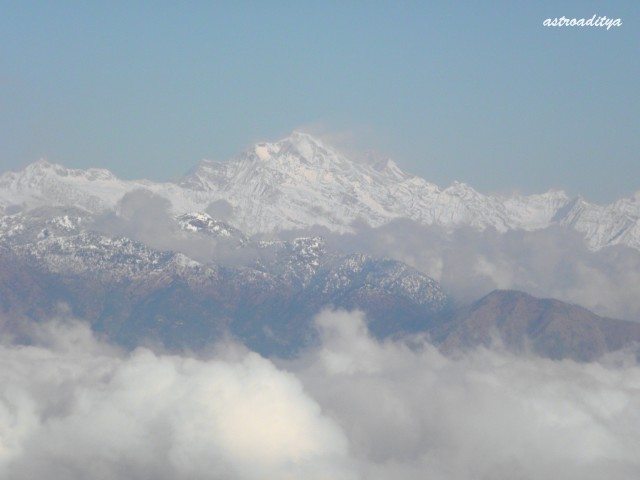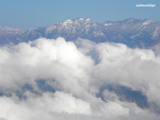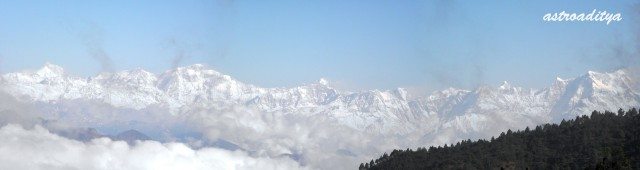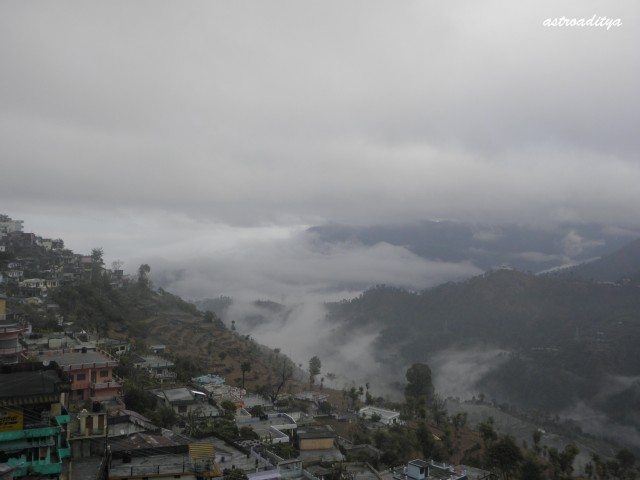 It was 3.30 am and we reached Kotdwar. As soon as we got down from the bus, we heard 4-5 taxi drivers shouting at the top of their voices. We moved towards one of them and booked two seats in his sumo and were assured by him that he would start by 4.00 – 4.15 a.m. In the mean time we went to a shop nearby and had some tea. After waiting for another half an hour, as the driver was busy loading fresh copies of newspaper under the seats and looking for more passengers, we started moving towards Pauri. As soon as we left Pauri, i could see more and more stars in the sky, i was all exited as the sky was clear and was hoping to spot Milky Way from Khirsu. But soon the excitement was all gone because of the fog. It was near zero visibility. The driver was maneuvering through the snaky roads slowly and my eyes were all open, glued to the white line on the road. Fog disappearing and reappearing was the order of that night. It was 6.45 am, slowly the darkness was giving to the light and i could see the Himalayas emerging and the clouds hovering below them, i desperately wanted to click some pictures but my camera was lying in my bag at the back of sumo. The condition of the road was bad because of the rains and around 8.00 am we reached Pauri.