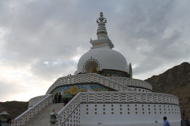 With the decision taken, we bade farewell to Anil, Sukrit, Himanshu, Royd, Ashish, Prajosh and Gaurav as they rode on to Nubra Valley. With heavy hearts, Jitu, Harsh, Sandy and I started our ride back to Leh. Since this was a downhill ride therefore, Jitu did not face any difficulty. A little while later, to our pleasant surprise, we saw Prajosh returning. We quickly stopped and asked why he returned instead of moving on to Nubra. He advised that the road was very bad and there was a landslide that was being cleared. He realized that his rear tire was wobbling and therefore, chose not to risk being stranded in the no man’s land. So now, the five of us, made our way back along with Aditya and Abhishek. This was the first time that Aditya and Abhishek were coming on a bike ride. Although the covered the distance from Delhi-Leh by air, they were very keen to ride till Khardung La as a personal feat. Due to AMS, Aditya’s health started to deteriorate due to which even they decided to return to Leh. On our way back, Harsh had a close brush with death when on one of downhill turns, his front brakes failed. Luckily, he managed to control his bike with his legs and stopped it at the nick of time. In a short while, we returned to Leh. Jitu, Harsh and Prajosh proceeded to get their bikes fixed. Sandy, Aditya, Abhishek and I returned to the hotel and started to think on how we wanted to spend the next day since the rest of the guys won’t be coming back before evening. Aditya was longing to eat pancakes and pastries so we decided to go to a nearby continental restaurant. The food wasn’t great but the damage to our pocket was. In the evening, we visited the Shanti Stupa that was bang opposite to our hotel. It was a beautiful Stupa like structure built on top of a hill. The monument presented an amazing view of the city of Leh and had some breathtaking carvings of Buddha in his different stages of meditation. Far away, the majestic monastery above the superb Leh palace lay perched on a mountain top. A winding trek route would lead pilgrims and believers to the monastery from the palace