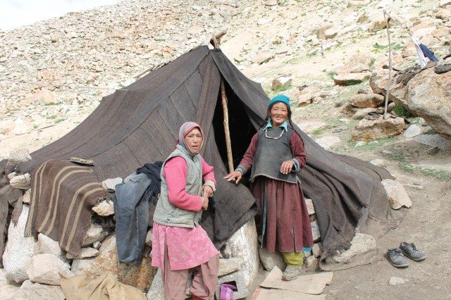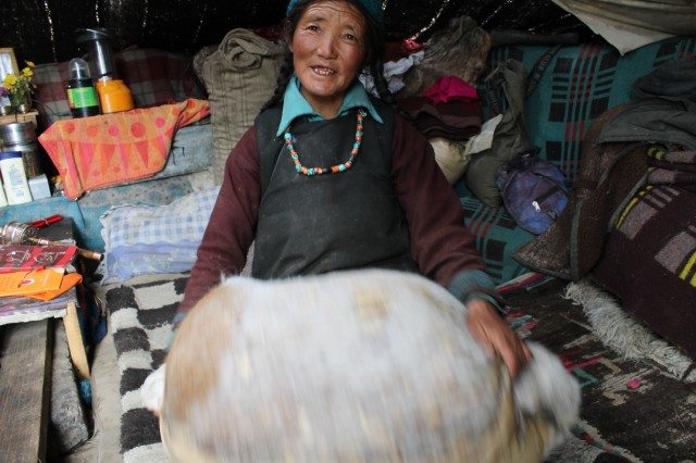 After our brief halt, we resumed our ride forward. Since Leh is at a relatively higher altitude therefore, the ascent from Leh to Chang La is not very steep. However, the region beyond Chang La drops to a much lower altitude and therefore, the descent from Chang La is even more dangerous than the ascent. And all the while we were descending from Chang la, I was getting more and more worried about our return journey when we would have to negotiate this virtual 45 degree ascent. After we rode down from Chang La, the ride became smooth. Just after Chang La, we stopped at a point that had this make shift dhaba made out of a tent. These were the elusive Changpas, an endangered tribal clan of Ladakh. We had a sumptuous meal of maggi and tea. While the food was being prepared, I ventured into the tent of the Changpa. I had seen this in the movie, āRiding Solo to the top of the worldā and it was a dream come true to have first hand look and feel of their tents. The lady of the house also demonstrated how they may butter from Yak milk using the bags made out of goat skin. Rustic but effective.