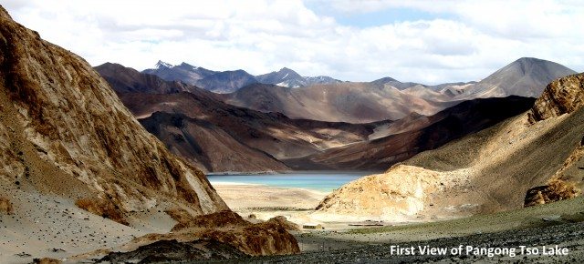 After consuming maggi we proceeded further. As we rode on, the mesmerizing landscapes of Ladakh started to open up in front of us. This part of the Ladakh valley is called the Changthang Plateau. A vast expanse of land with no sight of human civilization, awe-inspiring mountains absolutely parched with no rains were some of the striking features of this landscape. We took some amazing videos of our ride on the road to Pangong Tso. After riding for a little more time, we were getting impatient to see the lake. I could recall a similar experience while riding to Chandertal couple of years ago when we had almost given up on visiting the lake after enduring some of the roughest roads en route. But then, the moment of truth came. Just a little distance before the lake, there is a spot from where you get to see the first view of the lake and this is how I would describe it: