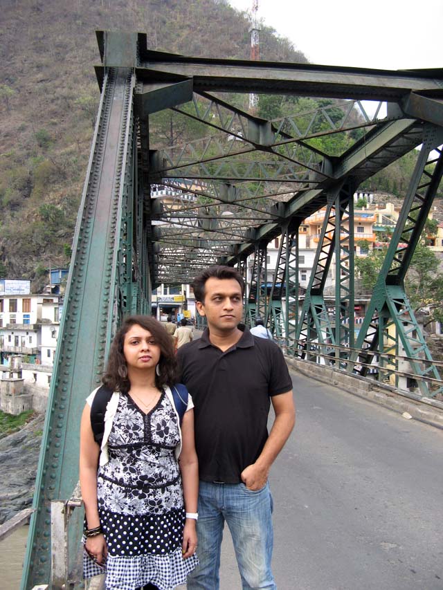Sis and bro-in-law posing before the bridge leading to the Rudraprayag ghats.