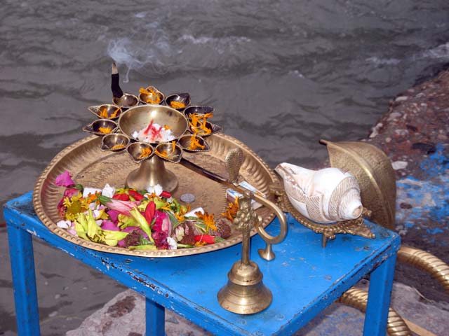 We enjoyed the mountain prayag storm sitting in the balcony for quite some time. After a brief light shower, winds stopped blowing and the sky cleared. We set off from the hotel and proceeded towards the auspicious meeting point of the green and the brown. We parked our car in the market place, and after a 4 km trek through the Rudraprayag market and through the bridge, we climbed down quite a few steep stone stairs to reach the prayag sthal well before the evening aarti. We frolicked on the ghats; enjoyed the sights and duet songs of the torrentially turbulent mountain rivers; tried to dip our feet and hands into the freezing cold waters by carefully holding on to the side chains meant to prevent falling into the flowing current; and sang songs and watched a handful of pilgrims happily washing off their sins by dipping into the frozen prayag waters. We clicked some nice shots and soon it was time for aarti. The evening aarti created a magic and added to the surrealism of the atmosphere. The big heavy Diya or Panch pradeep was handed over to all devotees by the purohit one by one to offer their prayers to the river Goddess as the purohit continued to chant the devotional songs and mantras in his high-pitched voice over the microphone. It was a moment of truth.
