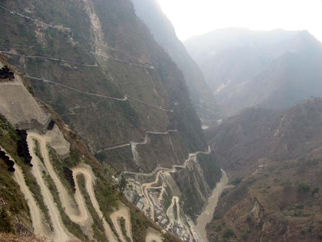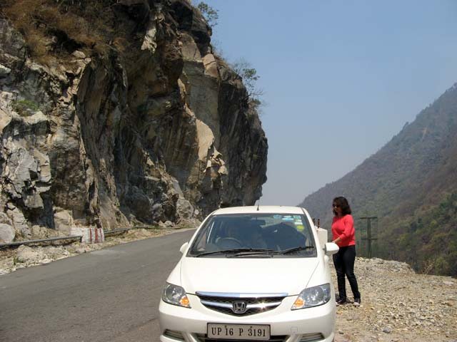 This route was not the familiar green Himalayan terrain that we encounter in Himachal or Uttaranchal. This was a more of a hard exterior exuding strength and character. The terrifyingly threatening, curvy narrowing roads snaking around the mountains as we crossed several mountains one by one were a sheer thrill. The drivers (my husband and brother-in-law alternating) were enjoying the drive while the women and the child enjoyed music, nature, beauty and thrill. The ladies took turns to sit beside the driver’s seat and sometimes literally had their hearts in their hands as the car edged up and across the steep mountain ridges. The more we tried to concentrate on the beauty, the more we were overwhelmed with nature’s stupendous creation, of the ribbon like numerous waterfalls rolling down the mountain sides, of the glistening reflecting rays of the sun that lured us further into its folds.