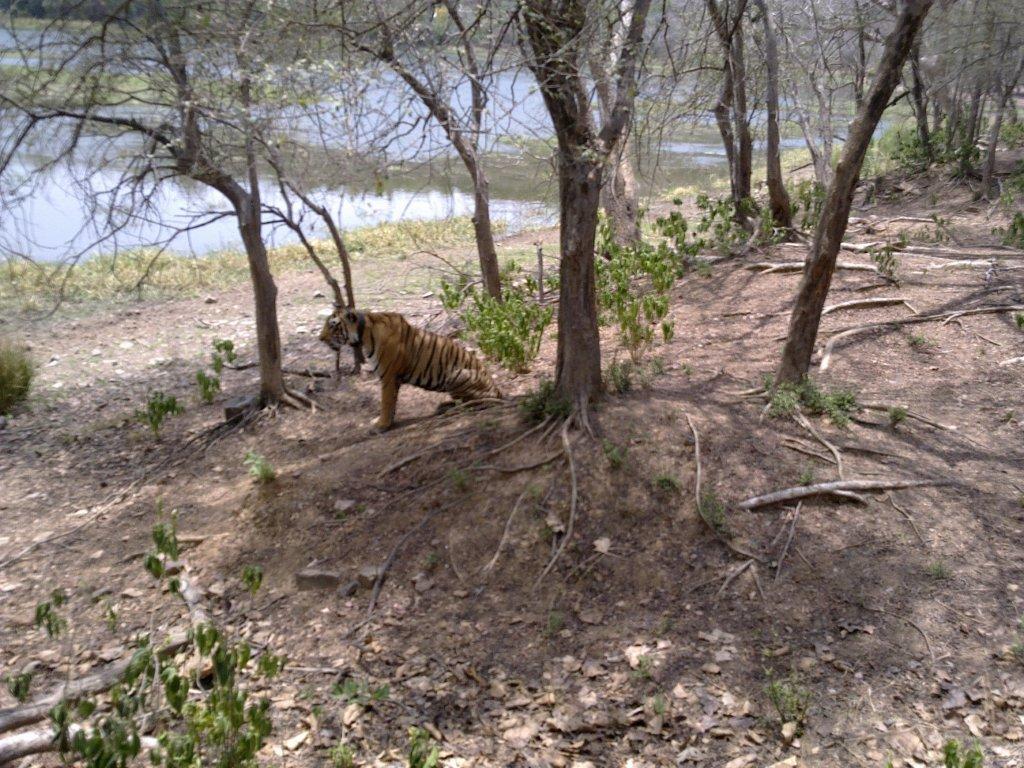 We moved to our new location with the essentials – a bag, water, binoculars, the torches and spears we had made, the good part of this location was it was in the corner and had only one approach, so we blocked the entrance with dry branches and pieces of rock we could find close by, but the bad part was that it was only two feet above the ground and was only 10-15 meters away from the pathway re-enforced by the movement of wild animals including the tiger. Within minutes after we had moved, the tigress moved into the tomb, the strong smell of urine became stronger, we could hear the heavy breathing till early in the morning. I was at least sure of one thing, that we would certainly have the tiger sighting, it was just a matter of time…It was a strange feeling of excitement and fear; to tell you the truth, such a feeling could never possibly be expressed….There was no time to focus on my fractured wrist; not until my dear friend Vishal decided to sleep, he slept like Kumkaran, like he hadn’t slept for ages – Great! Here I was in the middle of jungle with one fractured hand, a few feet from the tigress, no where to run if attacked, the only way to go was 20 feet down into the dry lake, can’t climb the tree next to this small tomb because of the injury. To add insult to the injury, I had to be more vigilant now because Vishal had fallen asleep and wouldn’t wake-up, no matter what; I couldn’t go no where, never been so helpless and angry; “He is not to go to jungle with us ever again, I kept telling myself….