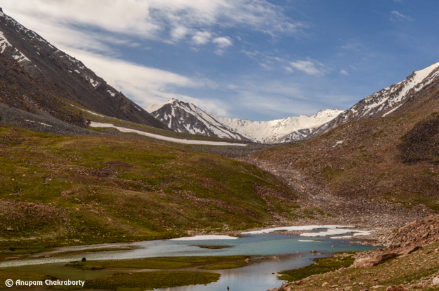 We started descending from Khardung La. By now ‘Rahman’, the driver of our car became familiar with me. As I pointed the camera, he stopped the car. I came out to click. A small lake surrounded by the mountains just below the Khardung La looked so beautiful.