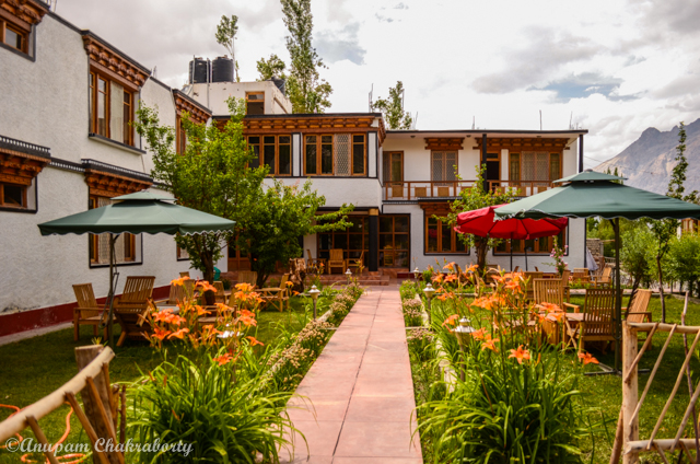 We arrived in the Sten Del Hotel at Diskit. The village Diskit is the administrative head quarter of Nubra valley. We booked the hotel in advance and were very happy to see the beautiful garden lawn of this well maintained property. The main attractions of Nubra Valley, viz. the great Sand Dunes of Hunder and the 15th century Diskit Monastery are within a short distance from the Hotel Sten Del.