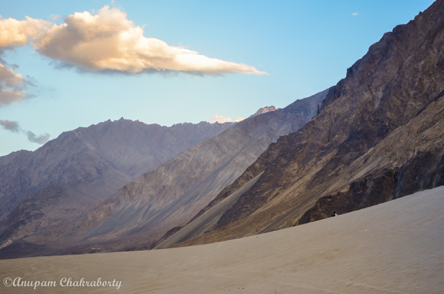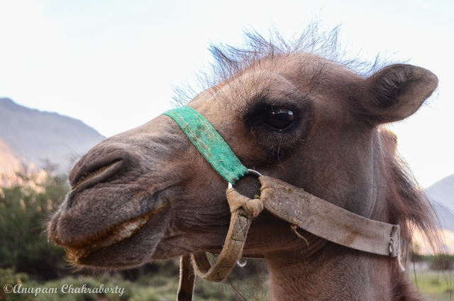 Usually deserts occur in low altitude, such as the great Indian Thar Desert. But there is also one high altitude cold desert in India which occurs in the Hunder village of Nubra Valley. A desert with silver sand dunes at an elevation of more than 10000 feet above sea level! Under the stunning blue sky the desert is surrounded by the barren mountains with camels around! These camels are different and very special; they are double humped Bactrian camel. The camels found in Rajasthan and other parts of India are single-humped camels.