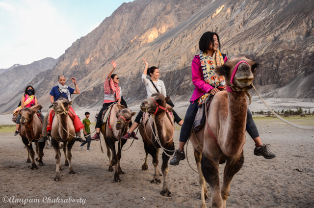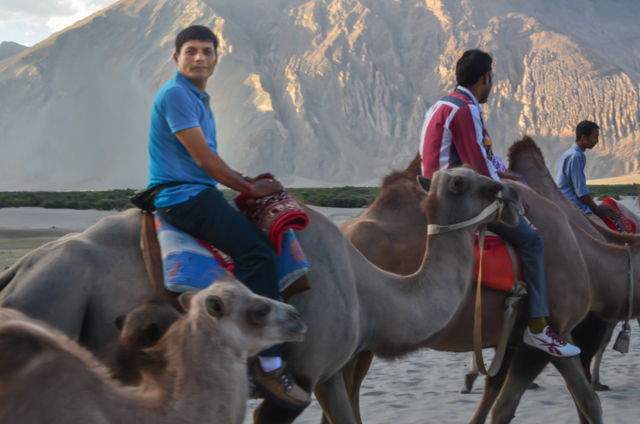 The sand dune offers to its visitors the great Central Asian double-humped camel safari. While other visitors were busy in getting their turn first for the safari, I went close to the camels. They look the same normal camels except those two humps. For the first time I saw those camels. Tourists were comfortably sitting on them with the support of those two humps. Everyone there seemed to be so happy with the joyride that we too decided to go for it. The prices of joyrides vary according to the distance of travel. We took a short ride and had a fantastic experience of riding those double-humped camels on the sand dunes of Hunder.