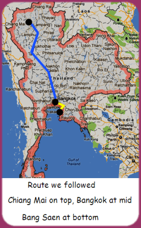 Soon after landing at Suvanrnabhumi airport, Bangkok we picked up the car and moved south to Bang Saen, a local beach-destination some 100 kms south of Bangkok. Thereafter, we drove to Chiang Mai in North Thailand, bypassing Bangkok (Bangkok to Chiang Mai is about 700 kms). After 7 days, we were back in Bangkok handing over the rental car and spending the last 4 days in Bangkok, before boarding the flight back home.