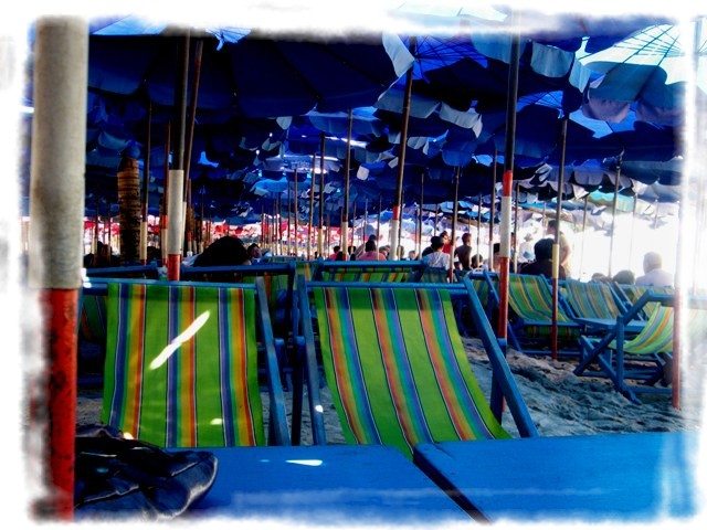 On this weekend day the beach is a “families day out” scene. Families and groups of varying composition have gathered here, as if for a celebration. It is high water time and waves have laid claim to most of the beach front. Outside this, the area is laid out with unending rows of umbrellas erected like a continuous canopy; beach chairs & tables spread squarely under them. The seating can be hired for a small fee for the whole day. We book a 4-seat setting next to the waves and get on to our business; daughter runs into the waves, madam lays herself luxuriantly on the chair and I scamper to the food stalls lined up across the promenade. We spend almost the entire day (as against our plans of limiting it till noontime) enjoying ourselves, observing others and getting into scrambled chats with the locals.