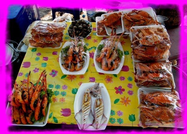 The food scene here is amazing. There are rows of eating joints with sit-outs offering wide variety of seafood and other stuff. We try some known and some unknown recipes. Seafood exotica on offer include prawns, shrimp, squids, mussel, lobster, oyster, sponge apart from fish (includes some unknown varieties), chicken, mutton, pork etc. The main dish is complemented with sticky rice or noodles.