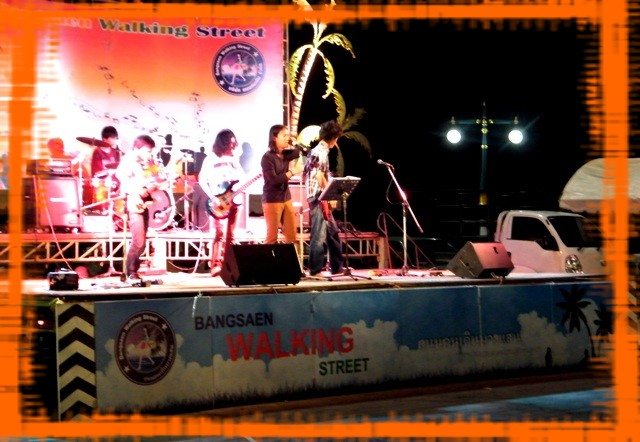 The concept of walking street here has probably originated from nearby Pattaya. This is a make-shift market set up on weekend nights on the beach front, off-limits for vehicles. The scene is supplemented with performance by in-house band groups, mostly students from local university. It makes a heady mix of street market selling exotic wares, rows of food stalls and a live band show on the backdrop of breezy Gulf of Thailand. On offer are funky jewellery, decoration stuff, paintings, tops, skirts, shorts, footwear, accessories and similar objects of desire, many times over. Other two companions are quick to get in ‘shop-like-tomorrow-may-not-be’ mode.