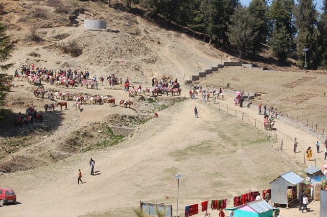 Well, we ate some tikki, chhole, fruit chaat besides taking some photographs before settling down in our respective seats in the Alto to continue the tour. The next stop was the base camp of Mahasu where taxi cars are to be parked and the tourist continue either on foot or on the back of mules to reach the Mahasu peak. It may be 2 or 3 km. from the base camp to the peak and the route is muddy and full of loose stones. There are perhaps 500 or more mules serving the tourists by taking them from the base camp to the peak and bringing them back after a few hours. Through some inexplicable magic, they can identify you correctly among thousands of tourists when you decide to come back to the base camp. It is therefore needless to worry as to how you would identify your mule for your return journey. Even if you can’t recognize your mule, your mule will certainly recognize you! And why not? Who would forget his tormentor? The only thing a poor mule is allowed to offer you in return of your loading yourself on his back is some crap which doesn’t smell like fresh roses!