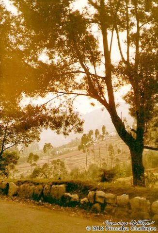 Now as only two hours of daylight were left, I settled for walking along the main road and the short by-roads, towards Coonoor and then board a bus for Coonoor at nightfall and spend the night there. I bought bread, biscuits and a jar of jam at a shop, gobbled a pastry, seized a bottle of Nilgiri Eucalyptus Oil for my Ma, and set out. I finally ended up walking till 1930 , a distance of about 13 km. I wandered amidst pines, larches and streams and indulged myself in photography.I finished up the loaded film roll with a sunset shot through pines. My hand picked branches of pine, larch and one unknown conifer to take home.The very act of breathing mountain air was heady and the smell of the resinous conifers intoxicating!!