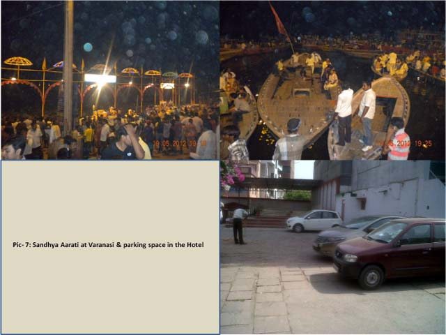 We didn’t find any problem to locate the direction of Varanasi – it is clearly visible if you are cautious. You need to leave NH-2 and take a left turn towards Varanasi and drive for another close to 13-15 kms to reach the Railway station. On the way, we found some signboards, pointing towards right, to reach various Ghats & Temples, but we decided to go to Railway station first and look for a Hotel. Yes, the road near Railway station is very congested, but we are used to this kind of roads, even in Delhi, Gurgaon, Ghaziabad. Suggest anyone to take Gurgaon Sadar Bazar or Goshala Phatak in Ghaziabad area in peak hours or even the road near Sikenderpur Metro Station in Gurgaon is worst at times. With the help of an auto rickshaw driver, we reached “Raj Mahal Hotel” in Gurubagh, Luxa Road, close to Dasaswamedh Ghat. Just before Railway Station, we took a right turn & drove approx. 2 kms. to reach the hotel.The hotel is decent and rooms are clean. We were happy as it provides safe parking space. The room rent was Rs.1,000/- for AC Room, including car parking charges (Rs.50/-). We were tired but we also didn’t want to miss Sandhya Aarati and Kasi Vishwanath Temple. We took bath one by one as soon as reach the hotel and charged the battery for some time to take some photographs. We took a rickshaw and then walked for 5 minutes to reach Dasaswamedh Ghat. The Sandhya Aarati took our breathe away. We have never seen such a live performance – they were at their artistic best. Finally around 8 p.m., the journey took its toll and my son couldn’t stand anymore and we decided to return to the hotel, with a promise to come back again and spend a few days to explore the city once again.