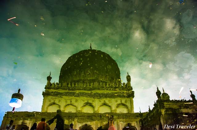 As the tombs are considered to be sacred by the locals in Hyderabad please take off your shoes before entering the individual tombs. You can wear your footwear while moving around. As the tombs are surrounded by very densely populated area they provided a green lung to the highly congested area around and you will find a lot of families with kids playing around. Please be careful not to take pictures of ladies and kids without permission as some of them could be sensitive about the same. I was trying to click some pictures of the reflection of one of the tomb in water and the result is the picture given below. You can see reflection of a family sitting on the edge of the water.