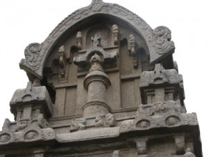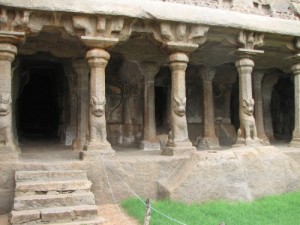 The main hill at Mamallapuram is dotted with pillared halls carved into the rock face. These halls or mandapas are carved with graceful columns and intricate figure sculptures. The Ganesh mandapa (Figure 2) is an active shrine even today, with the idol of the elephant-god being revered by the faithful, fourteen centuries after it was first consecrated.
