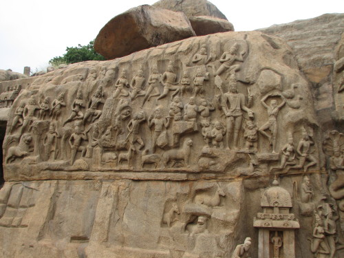 Some records indicate that the relief depicts King Bhagirath’s penance to Lord Shiva to bring down the Ganges down from the mountains of the Himalayas to purify the souls of his ancestors. Lord Shiva comes down to earth and lets the flood trickle through his hair, dispersing the waters safely in innumerable streams all over the world in order to safely disperse the water without harming the earth. This strange sight aroused the curiosity of the world’s animals, who gathered round the soaking God.