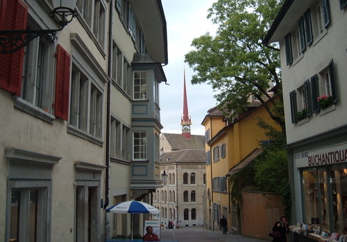 The Zurich skyline is dominated by four spires, with the dual towers of the Grossmünster on one side of River Limmat and the towers of the thirteenth century Fraumunster and St. Peter’s Church on the other. The Old Town spans this river, and some of the most interesting lanes and buildings are clustered along its banks. We headed there from Burkliplatz, the distance being just less than half a kilometer.
