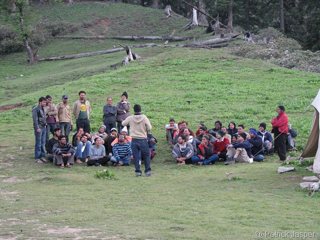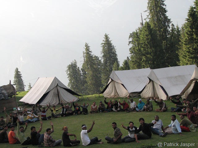 The climb down to Bhandak Thatch at 8000 ft is really pleasant and we did it real slow taking in all that scenery -Tall pine trees, luscious green meadows and a soft wind, not too cold but just right. It was like India’s Switzerland. The camp is also real good. There is just one spot where rappelling needs to be done to cross a feeder to the Parvati – All steams ultimately flow to the Parvati River. This last camp is really beautiful. It seems a lot of people give this camp a miss so as to finish the trek a day early but we felt it was worth the wait. The scenery is awesome and it is very very comfortable after the strenuous trek. We all played a game of throw ball (Muthugu Puncher in Tamil) with rolled up socks. We had our last photo sessions, group photos, sharing of emails, photographs, future plans, autographs etc,. as the next day we would be breaking up and everyone was quite emotional and charged up.