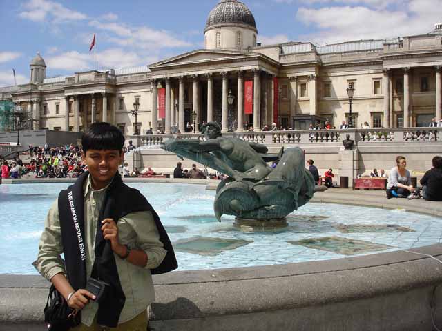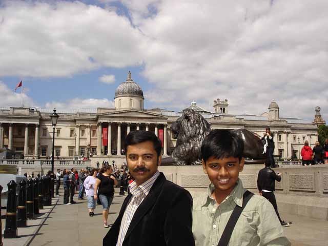 Today our plan was to take a cultural tour of London – it involved a visit to Trafalgar Square, the National Gallery & Buckingham Palace. We got up very late & naturally, left the house quite late. We did Trafalgar Square first, on the way there were a lot of shops selling London memorabilia. We thought of buying some right then but opted out of it, deciding to do the buying later. There was a typical red telephone booth on the way, so we clicked some photos with us in it.