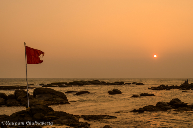 Early morning at about 6 am on the seashore, I was waiting for the sun to rise behind the Vivekananda Memorial on Bay of Bengal. The sky soon became warm with burning glow but did not last long. The mighty Sun blew up the sky all of a sudden and appeared flat. There was no sunrise view.